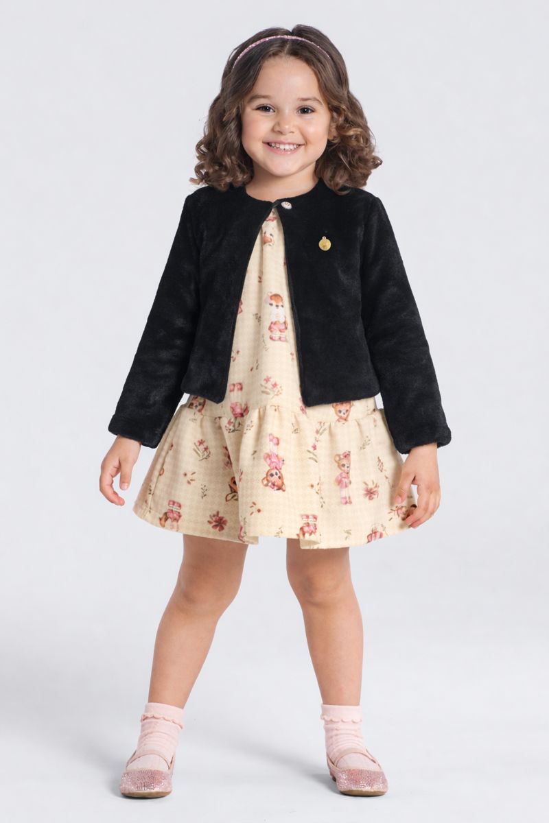 Casaco infantil menina confeccionado em tecido peluciado macio, no estilo bolerinho. Um modelo charmoso, quentinho e versátil, ideal para sobrepor vestidos e compor looks delicados e modernos.