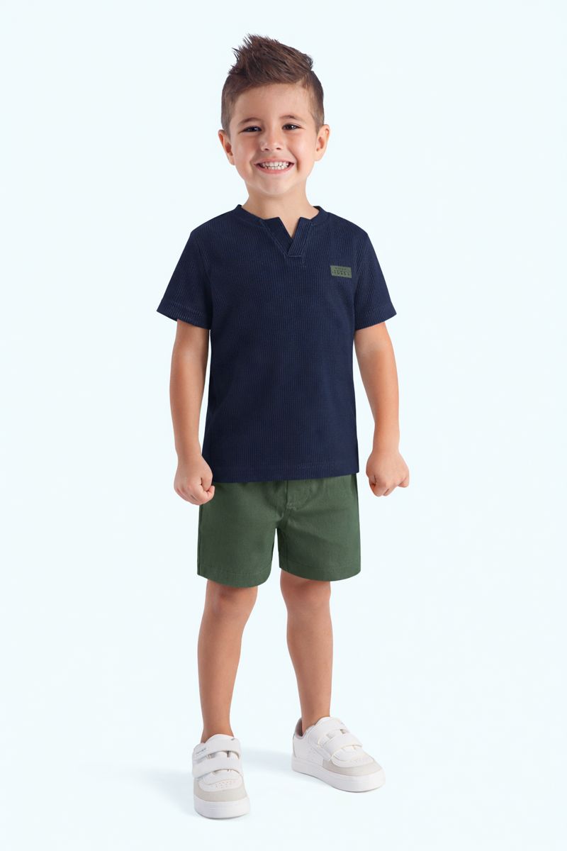 Um look prático e estiloso para o seu pequeno! A camiseta com peitilho em ribana trabalhada é super confortável, com uma textura diferenciada que adiciona um toque moderno ao visual. Acompanha uma bermuda em sarja com elastano, que garante conforto, flexibilidade e liberdade de movimento para as brincadeiras do dia a dia. A bermuda possui bolso funcional e braguilha falsa, unindo estilo e praticidade.