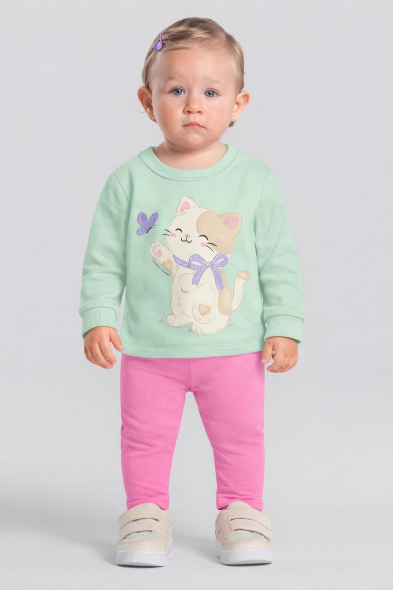 O blusão conta com mangas longas, gola redonda e uma charmosa estampa frontal de gatinho com glitter, que traz um visual lúdico e encantador, com brilho na medida certa. A calça em molecotton, com modelagem jogger e cós elástico, proporciona ajuste confortável, praticidade ao vestir e liberdade de movimentos.
