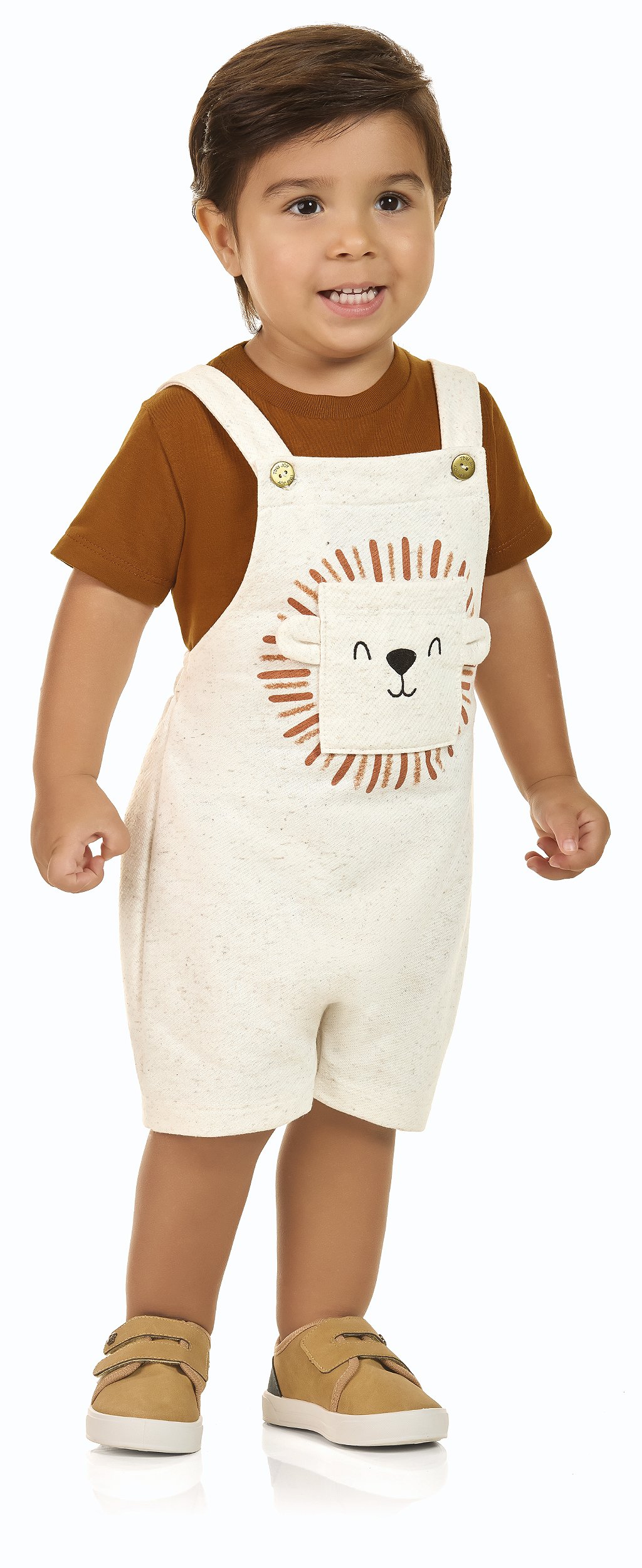 Um look super fofo e cheio de aventura para o seu pequeno explorador! Este conjunto é a escolha perfeita para o dia a dia, unindo a praticidade de uma camiseta com o charme de uma jardineira. A camiseta, feita em meia malha penteada super macia, garante o máximo de conforto para a pele sensível do bebê. Acompanha uma charmosa jardineira em moletom diagonal com linho, que tem uma linda aplicação interativa de leão e alças reguláveis para um ajuste perfeito. O fechamento com botões de pressão no entrepernas facilita a troca de fraldas, tornando o dia a dia mais prático. É a combinação ideal de estilo, conforto e diversão para todas as ocasiões!