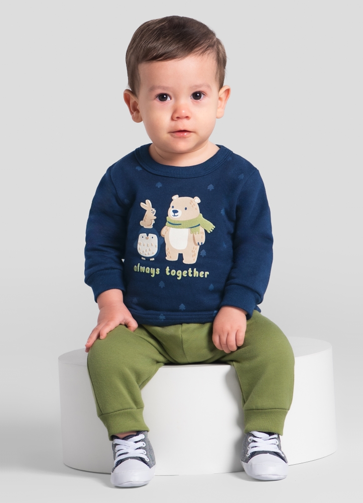 O blusão possui mangas longas, gola redonda e uma delicada estampa em puff de ursinho, trazendo um visual lúdico e encantador. A calça, com modelagem jogger e cós elástico, proporciona ajuste confortável, praticidade no vestir e liberdade de movimentos.