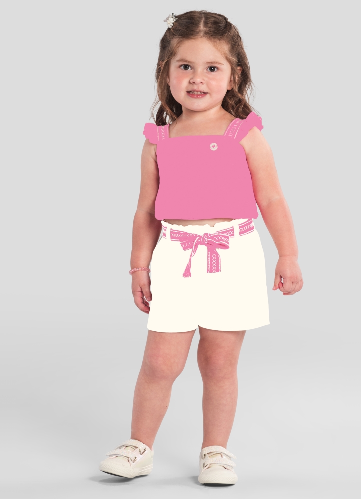 Um look super estiloso e moderno para a sua pequena! Este conjunto é a escolha perfeita para unir conforto e as últimas tendências. A blusa cropped, feita em meia malha, possui uma charmosa gola quadrada e babados nas mangas, que adicionam um toque único e especial ao visual. Acompanha um shorts clochard em sarja de cor lisa, com um prático cós elástico, passante de cinto e faixa para amarração, garantindo um caimento perfeito e muito estilo. É a combinação ideal de moda, praticidade e conforto para todas as ocasiões!