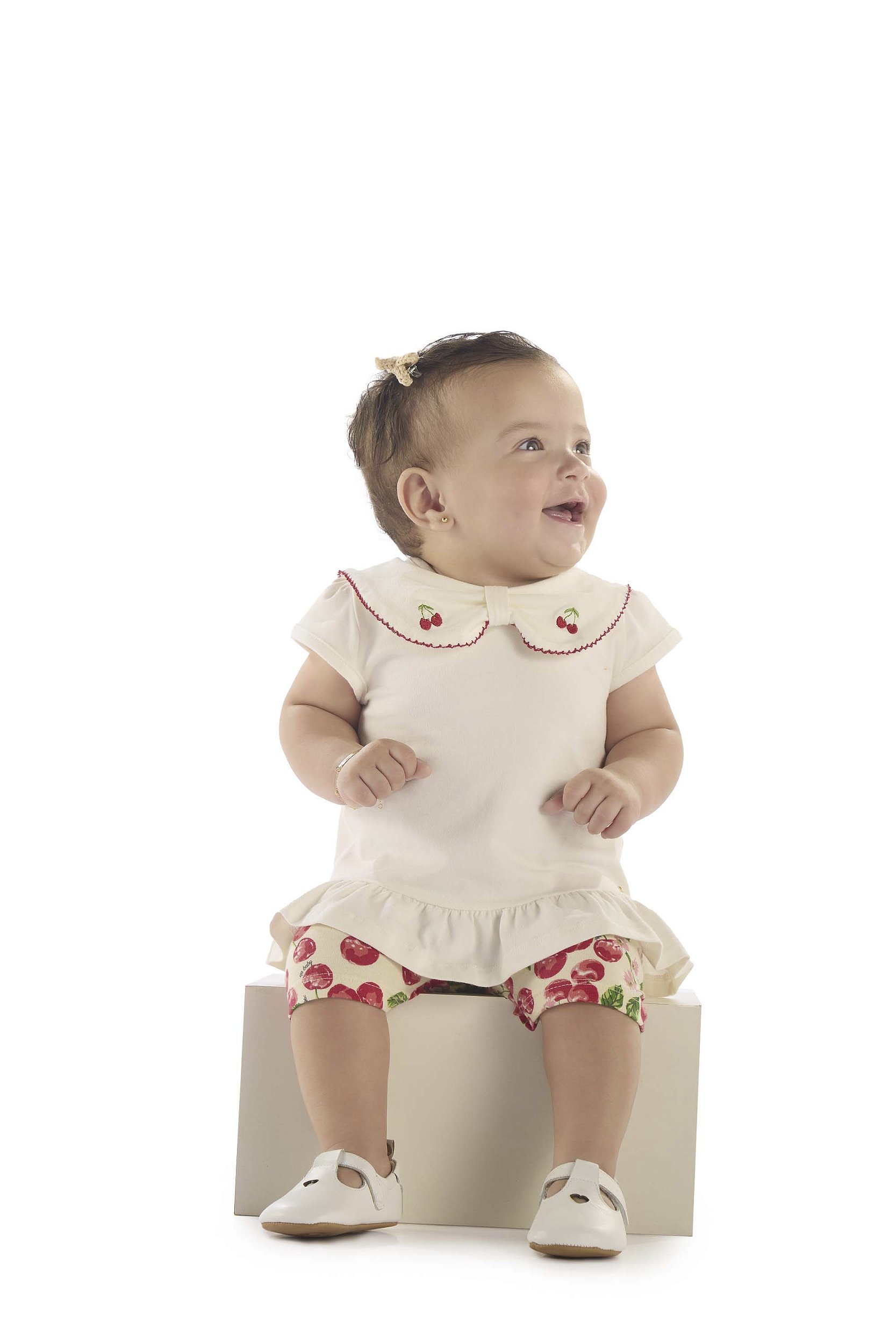 Possui uma divertida estampa de cereja, que harmoniza perfeitamente com o bordado da blusa.