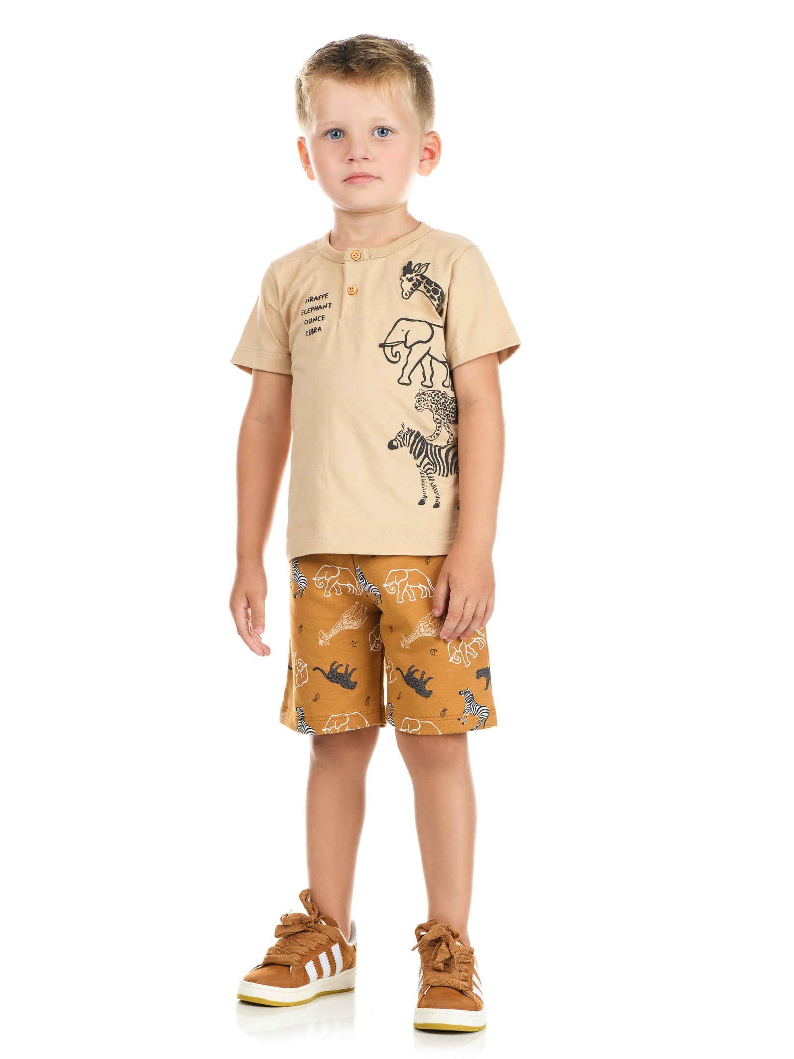 Conforto e diversão com um toque de aventura! Este conjunto é a escolha perfeita para um visual moderno e super descontraído. A camiseta em meia malha possui uma linda estampa em silk de animais na lateral e botões de madeira no peito que dão um toque de charme. A bermuda em moletinho estampado é super confortável, com uma estampa que combina perfeitamente com a camiseta, garantindo um visual cheio de personalidade. Feito com materiais de qualidade, este conjunto é ideal para passeios e brincadeiras, proporcionando total liberdade de movimento.