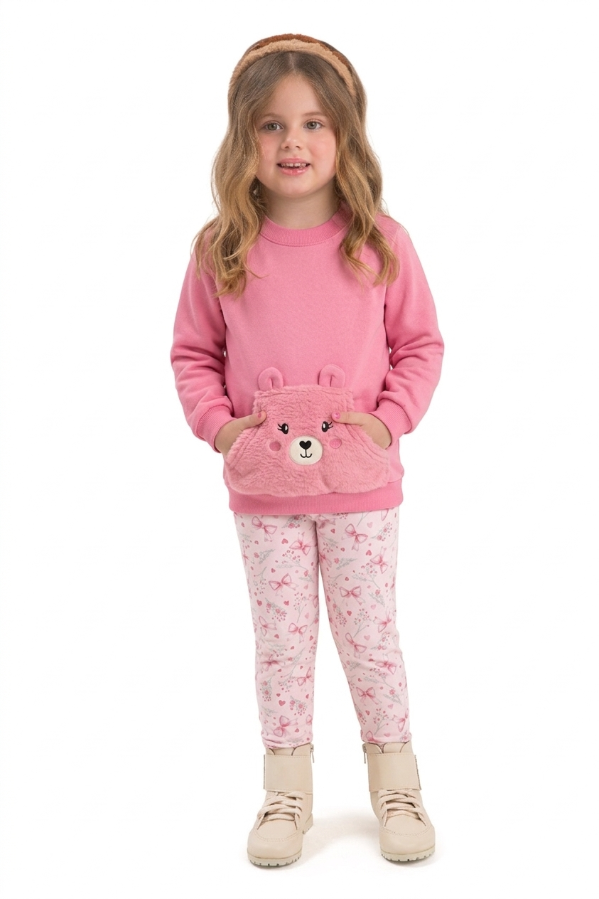 Conjunto infantil com blusão em moletom felpado penteado, bolso canguru em pelo com orelhinhas aplicadas e bordado em corte laser. Acompanha legging em molecotton felpado rotativo sublimado, garantindo conforto, estilo e muito aconchego nos dias frios. 🧸❄️