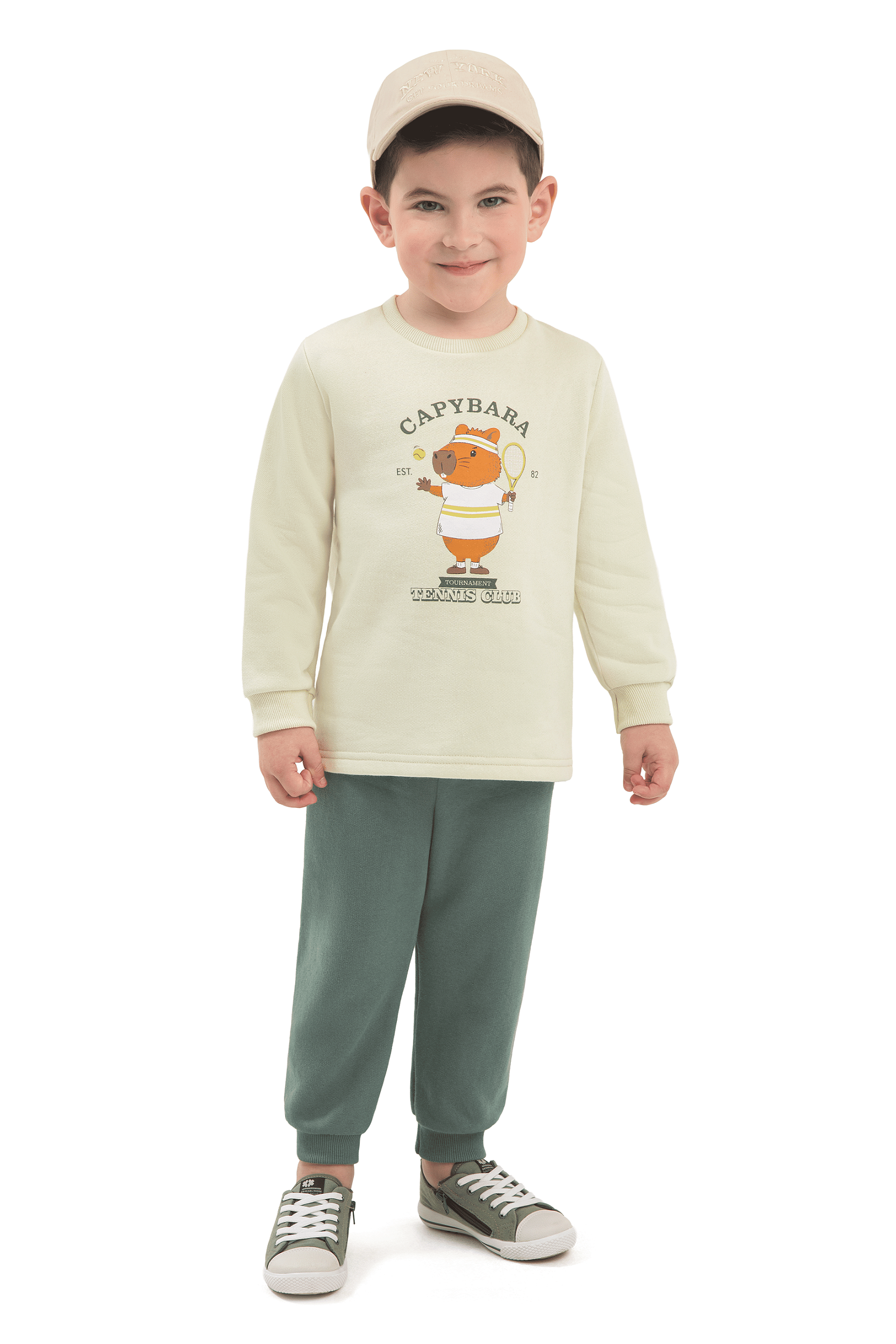 O blusão possui estampa frontal que traz um toque moderno e divertido ao visual. A calça em moletom felpado penteado complementa o conjunto com modelagem confortável, ideal para acompanhar os pequenos nas atividades do dia a dia.