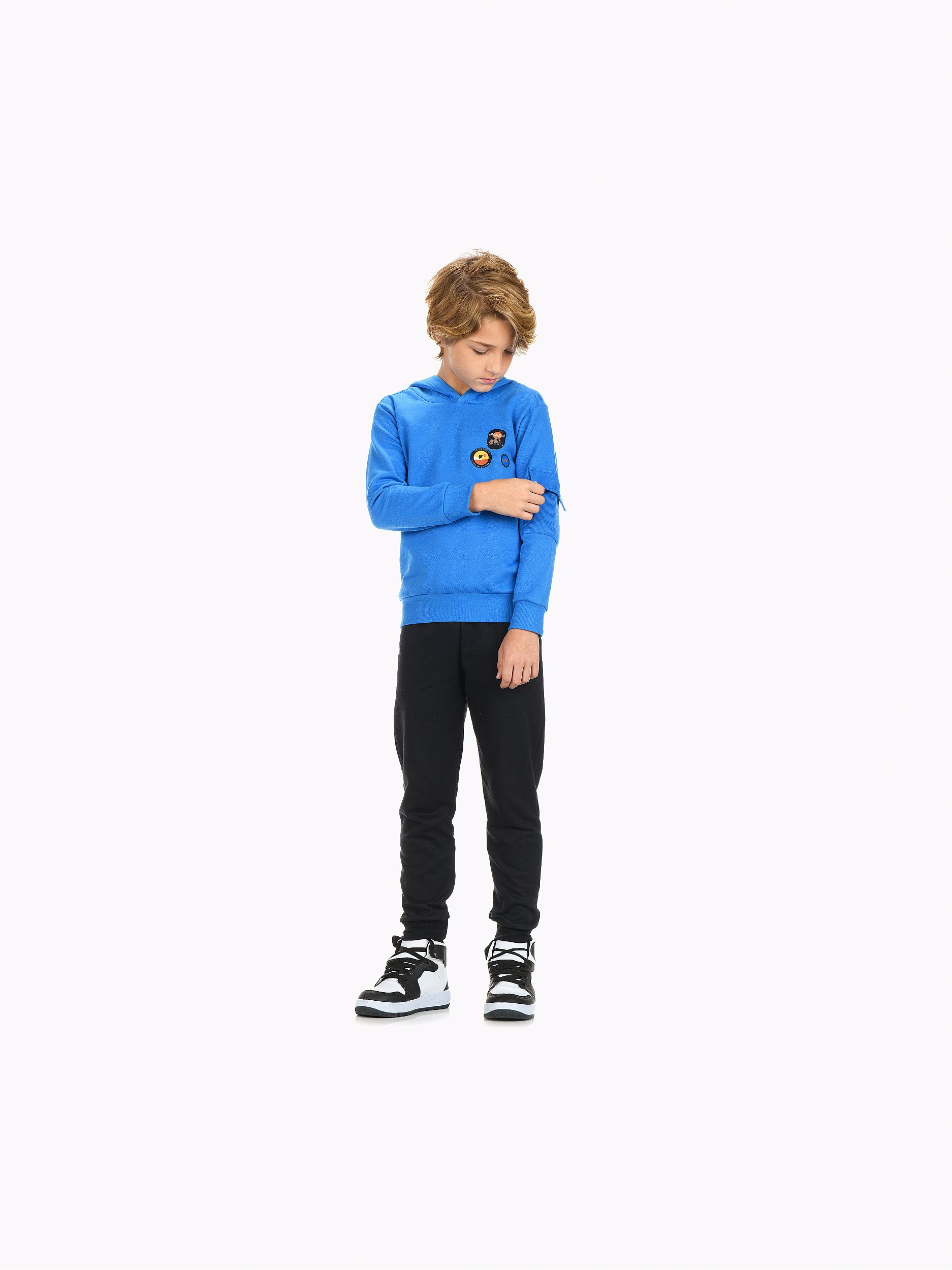 A blusa possui capuz e aplique de patch, adicionando personalidade e um toque esportivo ao look. Confortável e versátil, é ideal para escola, passeios e momentos em família.
