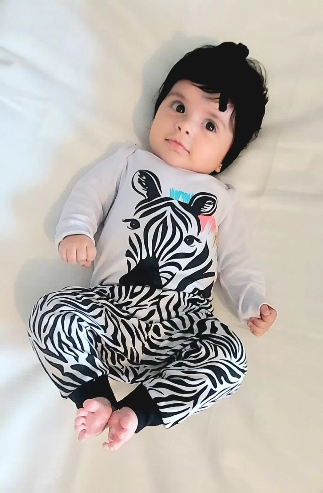 Princesa de roupa novinha é de derreter o coração! Este conjunto completo é composto por um body de manga longa, uma calça e uma faixa de cabelo, proporcionando um look super fofo e harmonioso. As peças são produzidas em suedine 100% algodão, um tecido macio com um toque aveludado, ideal para a pele delicada da sua bebê. O body possui uma encantadora estampa de zebrinha, enquanto a calça tem uma moderna estampa animal print. A gola transpassada e os botões de pressão no body facilitam a troca, unindo conforto, estilo e praticidade para o dia a dia.