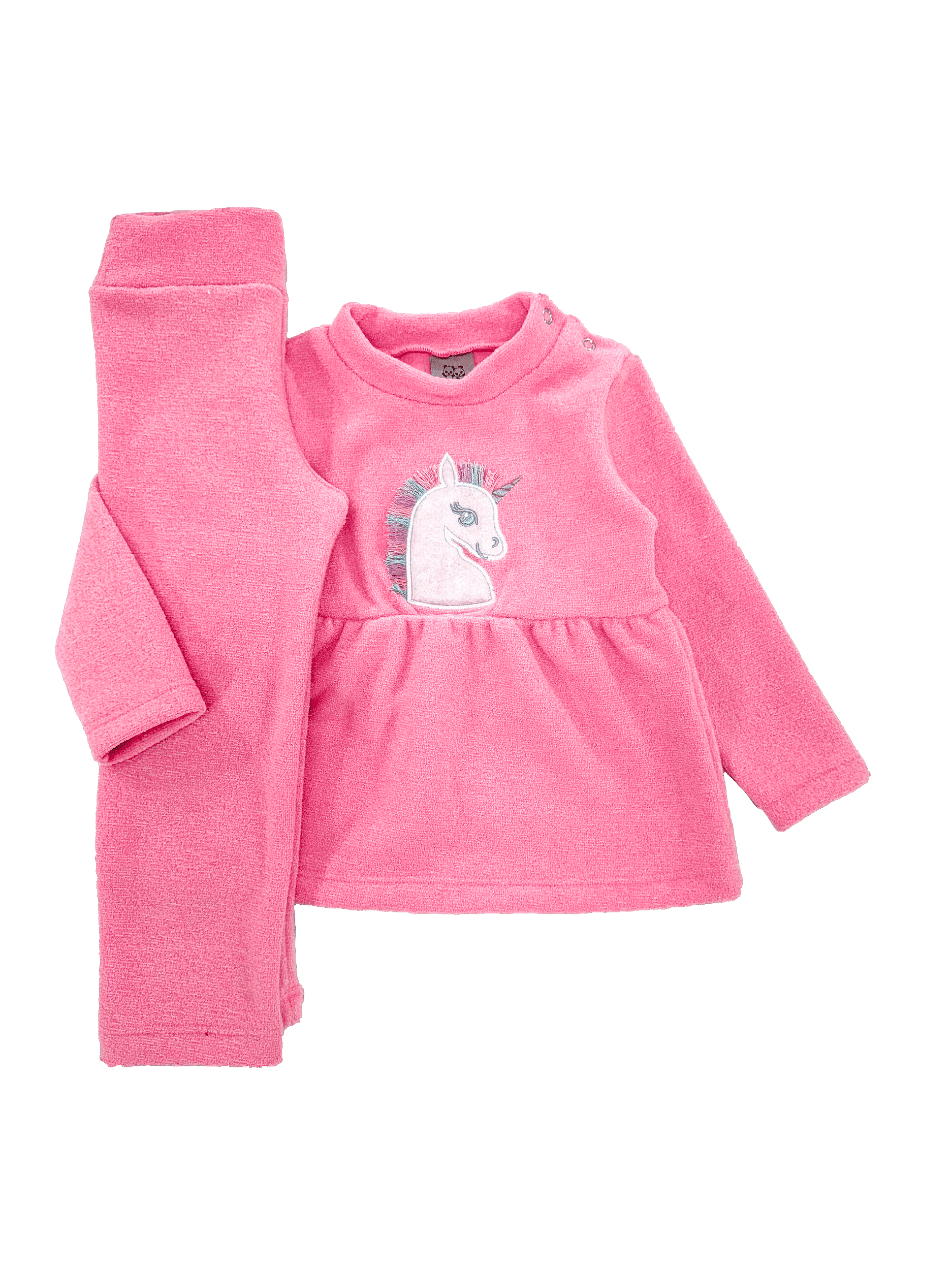 O blusão conta com um delicado franzido na cintura e um detalhe frontal de unicórnio com crina colorida, além de botões de pressão no ombro para facilitar o vestir. A legging completa o look com conforto e elasticidade.