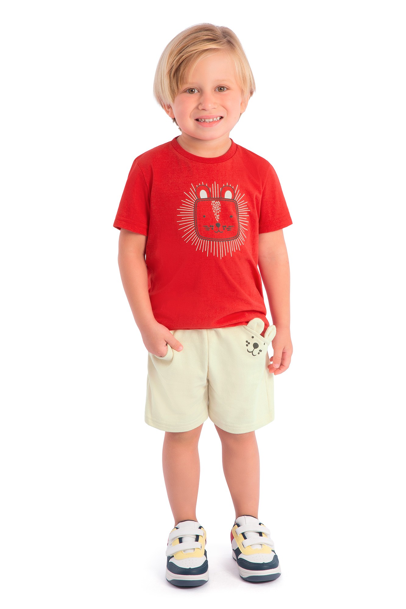Estilo e diversão com um toque de fofura para o seu pequeno! Este conjunto é a escolha perfeita para o dia a dia, unindo uma camiseta moderna com uma bermuda super macia. A camiseta de meia malha tem uma estampa com efeito em relevo que adiciona um toque único e especial ao visual. Acompanha uma bermuda em moletinho com um prático bolso e adoráveis orelhinhas aplicadas, que garantem total liberdade de movimento para as brincadeiras e aventuras. É a combinação perfeita de estilo, conforto e um design super charmoso!
