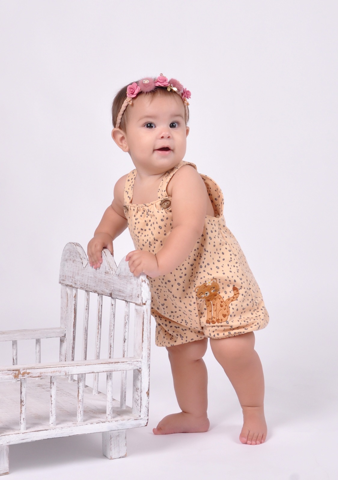 Uma dose de charme e estilo selvagem para a sua pequena! A Jardineira Jade Oncinha é a peça perfeita para os dias de diversão. Confeccionada em tecido macio, uma mistura de 67% poliéster e 33% viscose, ela possui um encantador bordado de oncinha e uma estampa de pintinhas que trazem um visual único. O fechamento das alças com botões de madeira adiciona um toque rústico e delicado. Com elástico nas coxas e botões de pressão na parte inferior, a peça garante liberdade de movimento e facilita a troca de fraldas, tornando a rotina muito mais prática.