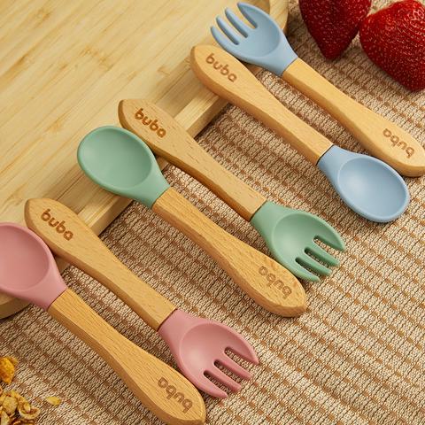 Facilite a introdução alimentar do seu bebê com o charmoso e seguro Kit Talheres em Silicone e Bambu da Buba!